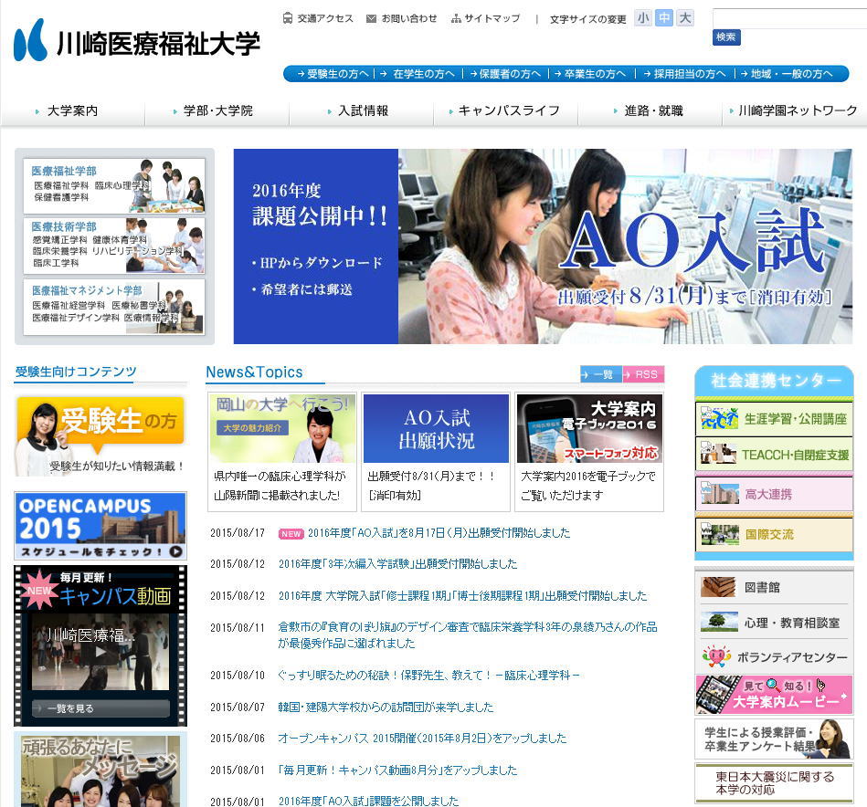 川 崎学園は、皆様方の御協力により、美しい自然に囲まれた理想的な環境の地に、医学・医療福祉の総合学園として、川崎医科大学、川崎医科大学附属病院、川 崎医科大学附属川崎病院(岡山市)、川崎医療福祉大学、川崎医療短期大学、川崎医科大学附属高等学校及び川崎リハビリテーション学院を設置し、その社会的 使命の達成にまい進しております。この度、社会人経験・実務経験のある方を対象に中途採用を行います。学園理念に共感し、これからの学園を支えていただ く、意欲ある方のご応募をお待ちしております。