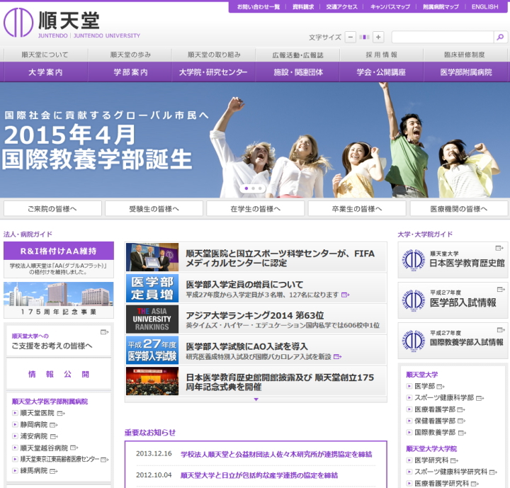 学校情報 順天堂大学 順天堂大学 X Facebook はてブ Pocket LINE コピー 2015.03.23 順天堂大学 ・学生偏差値:医学部70 ・求人難易度:★★★★ ・主なキャンパス:東京都文京区 【求人情報】 ・順天堂大学 事務総合職(新卒) 2016年5月13日締め切り ・順天堂大学 事務総合職員 2016年3月31日締め切り ・順天堂大学 研究推進支援センターでの【事務スタッフ】 2015年7月31日締め切り ・順天堂大学 事務総合職 2015年7月31日締め切り ・順天堂大学 情報センター 事務総合職(既卒者・管理職候補) 2015年3月31日締め切り
